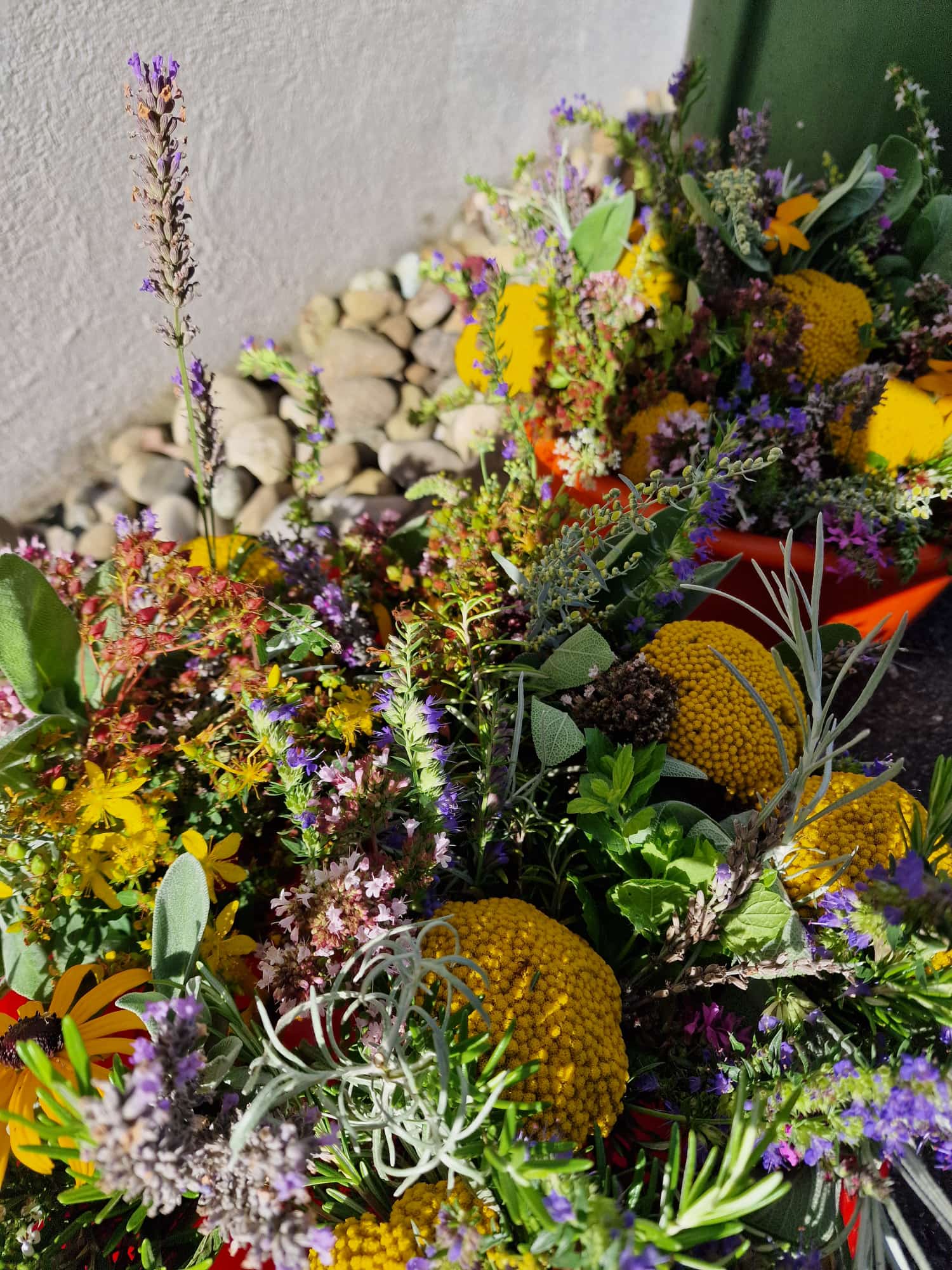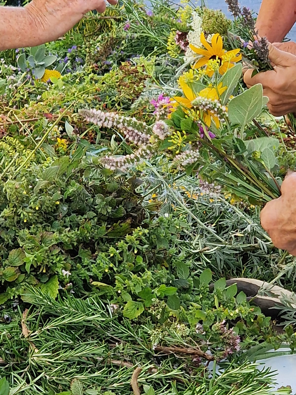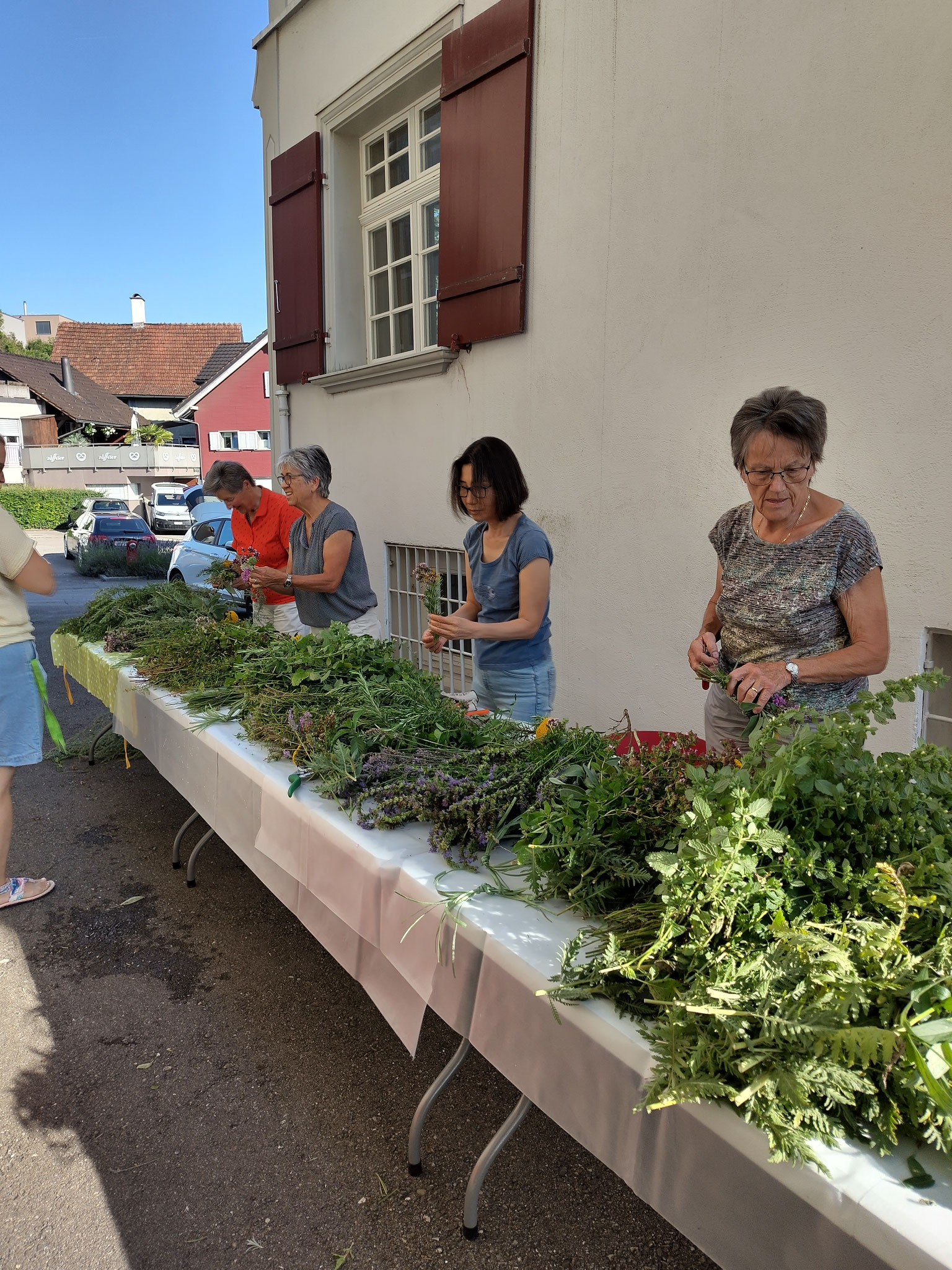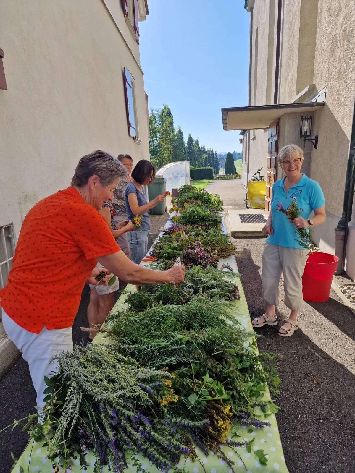 Salbei, Majoran, Blutströpfchen, Pfefferminze, Zitronenmelisse, Schafgarbe, Currykraut, Ysop und weitere Pflanzen wurden zu Sträusschen gebunden. Dabei fand ein Austausch statt über den Einsatz der verschiedenen Kräuter in der Küche. Spannend! Im Gottesdienst am nachfolgenden Sonntag wurden die Sträusschen gesegnet und an die Pfarreimitglieder verteilt.