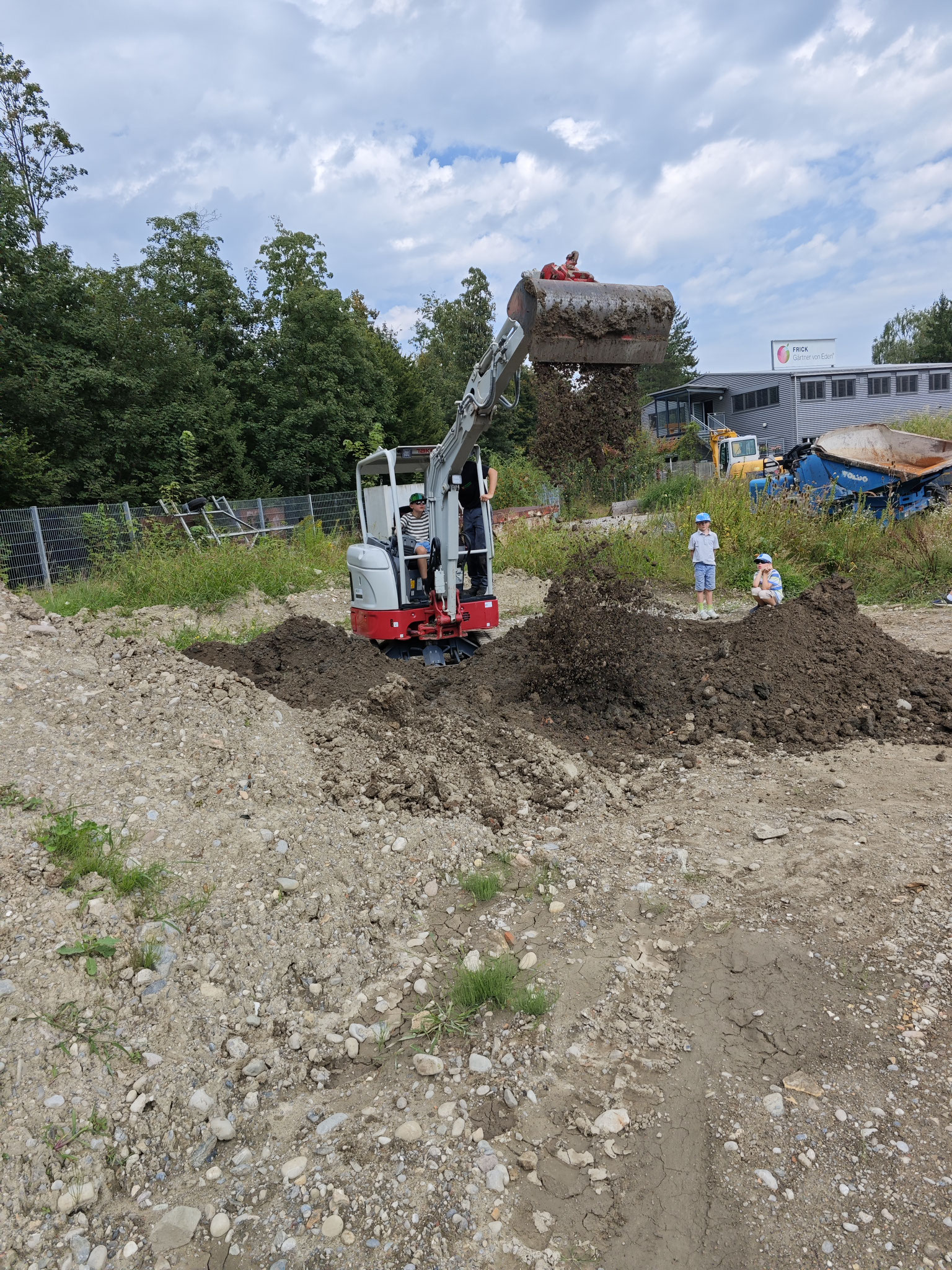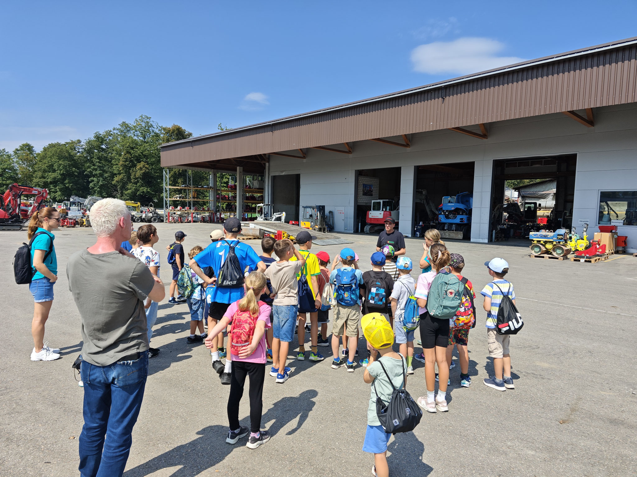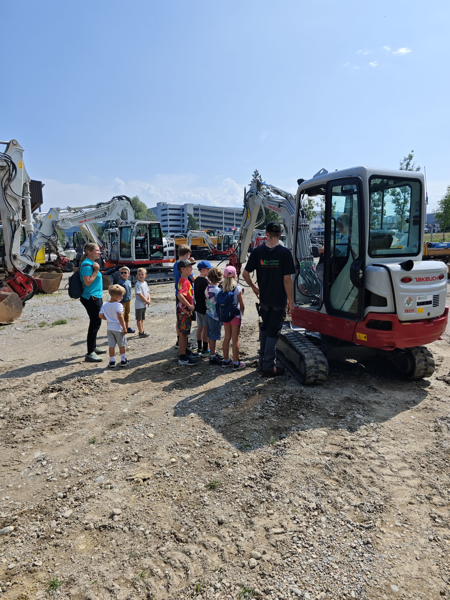 Die Gruppe wurde auf dem Firmengelände herzlich empfangen. Nach einer kurzen Einführung in den Betrieb wartete das grosse Highlight: Die Kinder konnten selbst in einen Bagger steigen und unter Anleitung ausprobieren, wie sich das schwere Fahrzeug steuern lässt.